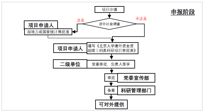 (一)申报阶段。校内教职工如申报或参加申报境外组织、个人、境外组织在华机构的项目,项目申请人须填写《北京大学境外资金资助理工科类科研项目审查表》(附件1),提交所在二级单位党委、学校党委宣传部审批,并在科研管理部门备案后,方可对外提供。