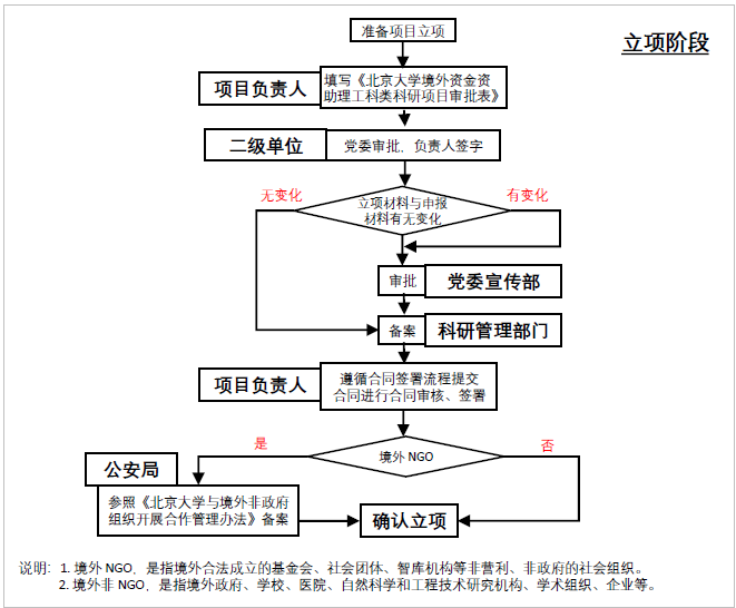 (二)立项阶段。校内教职工如需与境外组织、个人、境外组织在华机构签署项目合同,项目负责人须填写《北京大学境外资金资助理工科类科研项目审查表》(附件1),提交所在二级单位党委、学校党委宣传部审批,并在科研管理部门备案后,按合同签署流程提交合同进行审核、签署。