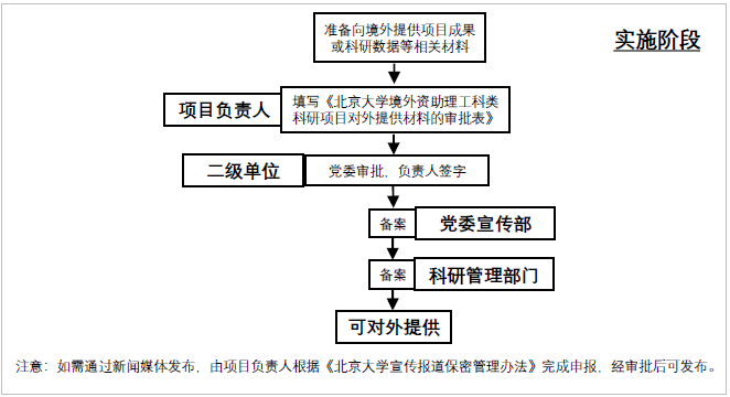 (三)实施阶段。项目组人员如需向境外组织、个人或者境外组织在华机构提供项目产生的相关成果或科研数据等,项目负责人须填写《北京大学境外资助理工科类科研项目对外提供材料审查表》(附件2),提交所在二级单位党委审批,并在学校党委宣传部、科研管理部门备案后,方可对外提供。项目组人员如需通过新闻媒体发布,项目负责人须根据《北京大学宣传报道保密管理办法》完成申报,经审批后方可发布。