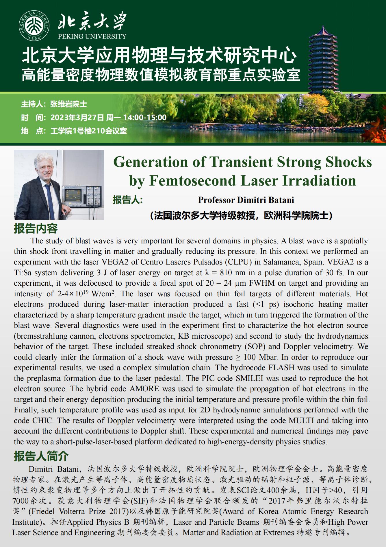 【学术报告】Generation of Transient Strong Shocks by Femtosecond Laser Irradiation