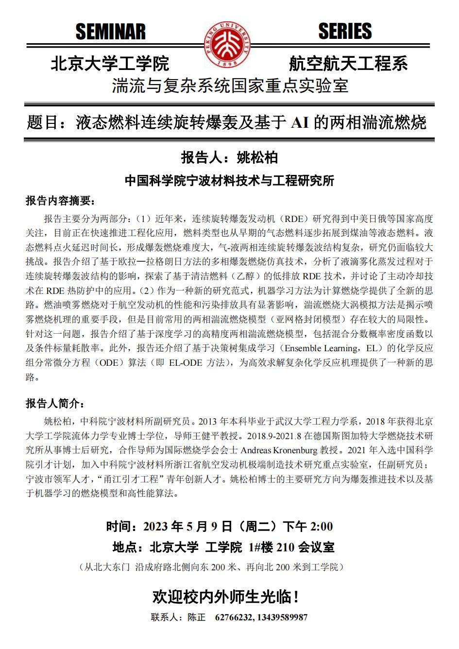 【学术报告】液态燃料连续旋转爆轰及基于AI的两相湍流燃烧