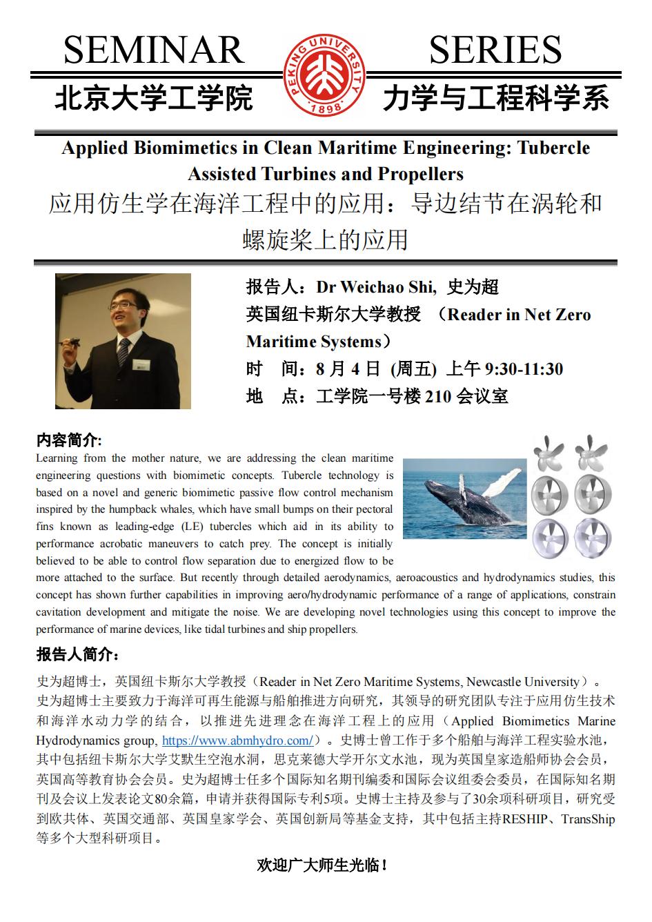 【学术报告】Applied Biomimetics in Clean Maritime Engineering: Tubercle Assisted Turbines and Propellers (应用仿生学在海洋工程中的应用:导边结节在涡轮和螺旋桨上的应用)