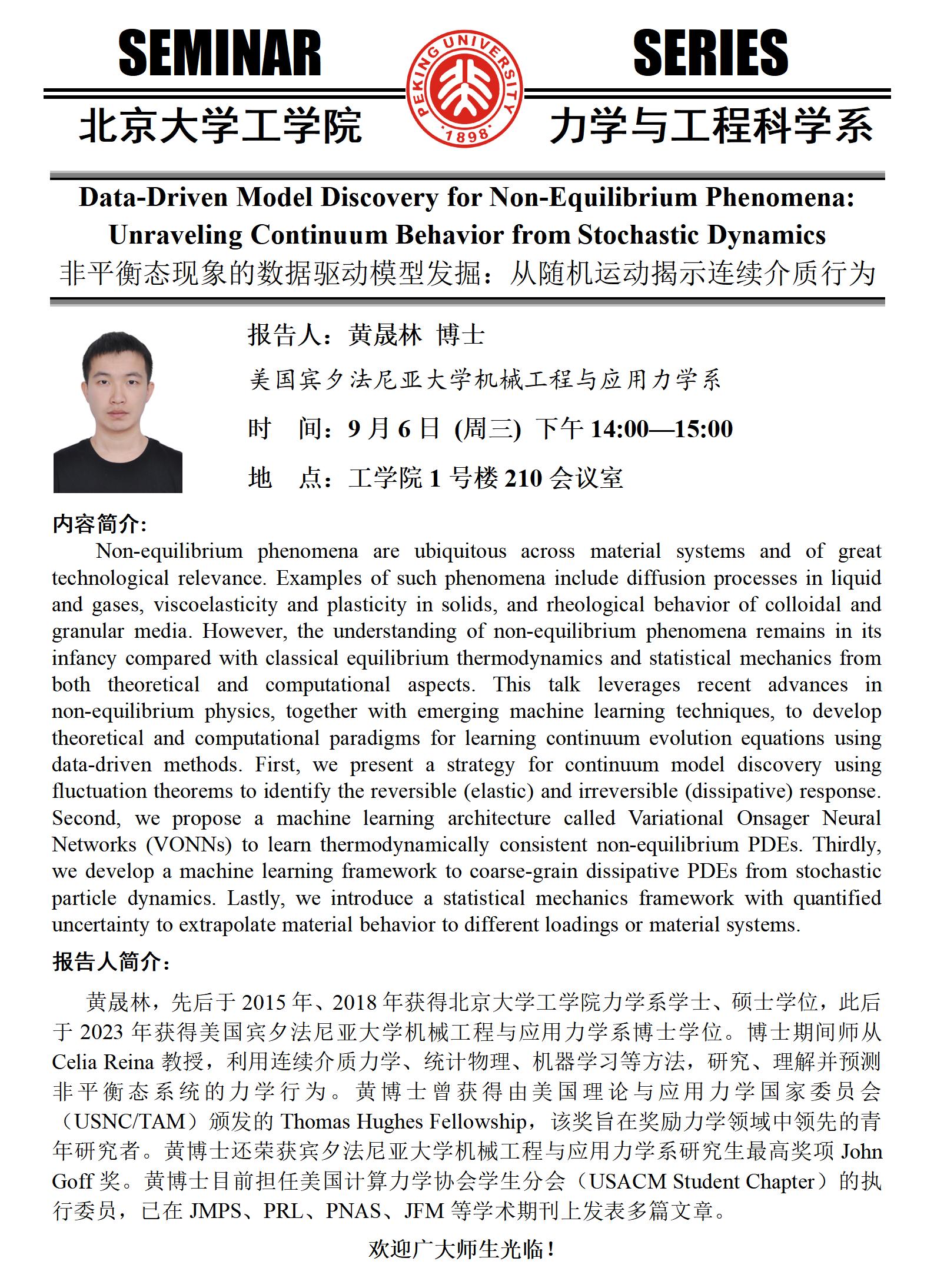 【学术报告】Data-Driven Model Discovery for Non-Equilibrium Phenomena: Unraveling Continuum Behavior from Stochastic Dynamics 非平衡态现象的数据驱动模型发掘:从随机运动揭示连续介质行为