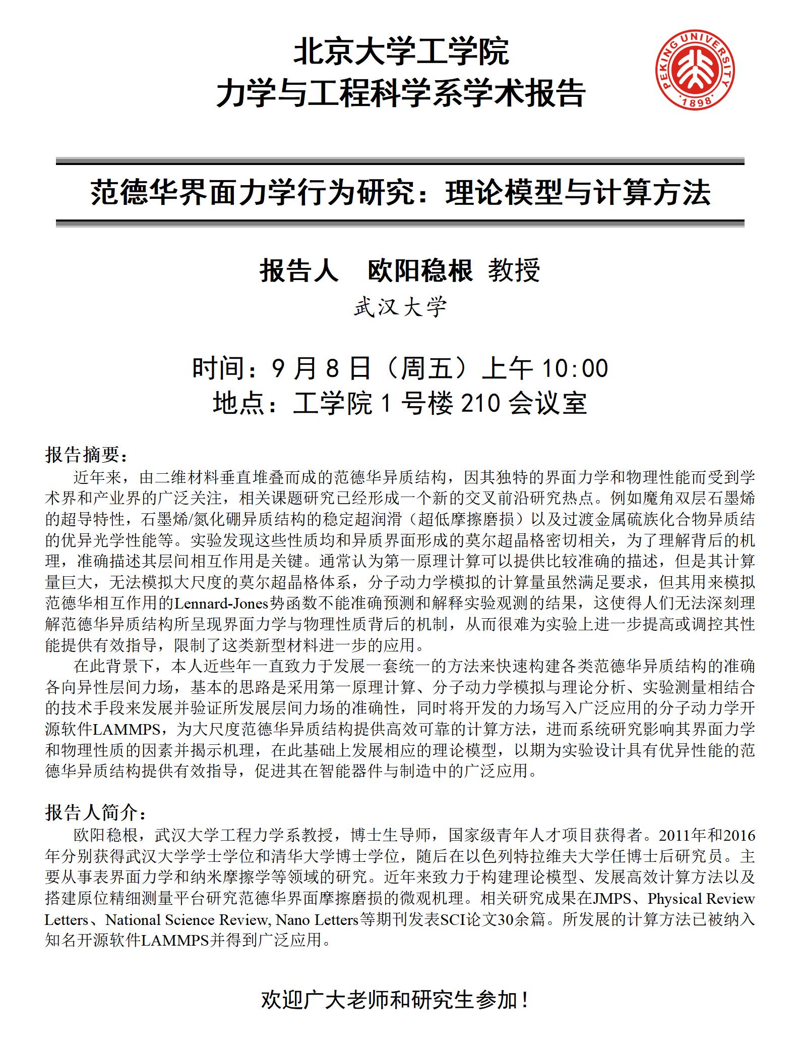 【学术报告】范德华界面力学行为研究:理论模型与计算方法