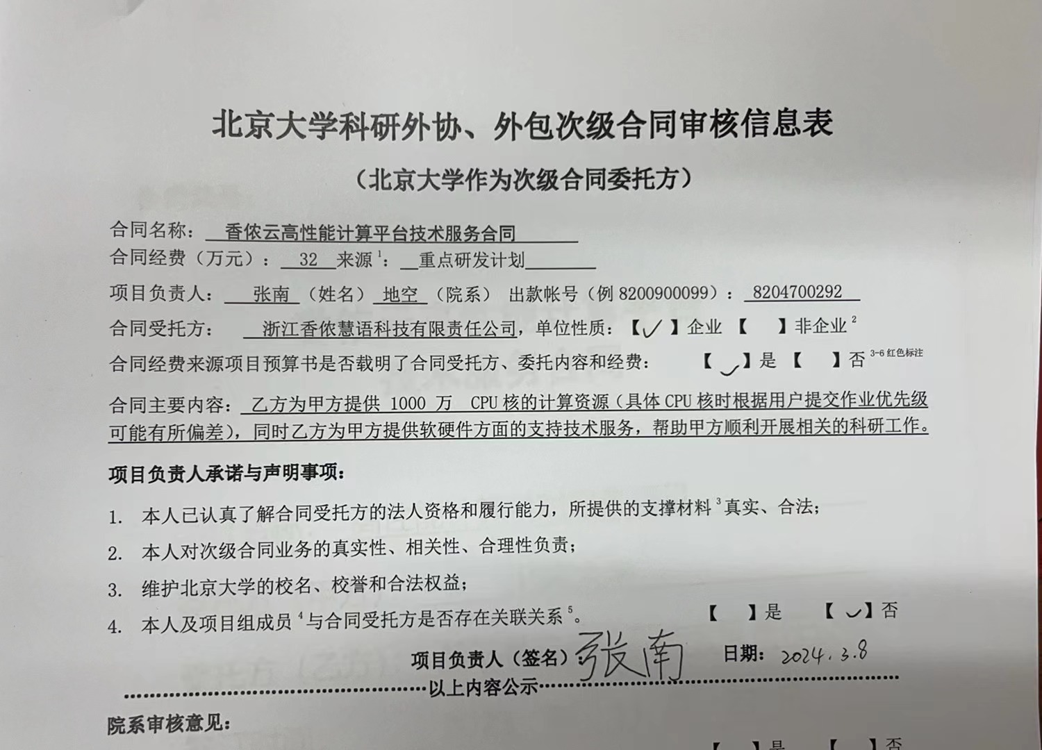 根据《关于北京大学理工科科研次级合同管理的通知》,现将北京大学理工科科研次级合同“香侬云高性能计算平台技术服务合同”相关内容予以公示。