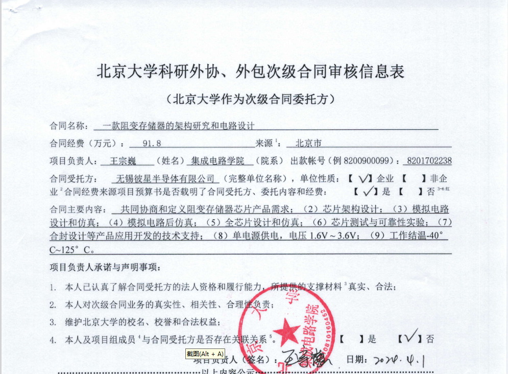 根据《关于北京大学理工科科研次级合同管理的通知》,现将北京大学理工科科研次级合同“一款阻变存储器的架构研究和电路设计”相关内容予以公示。