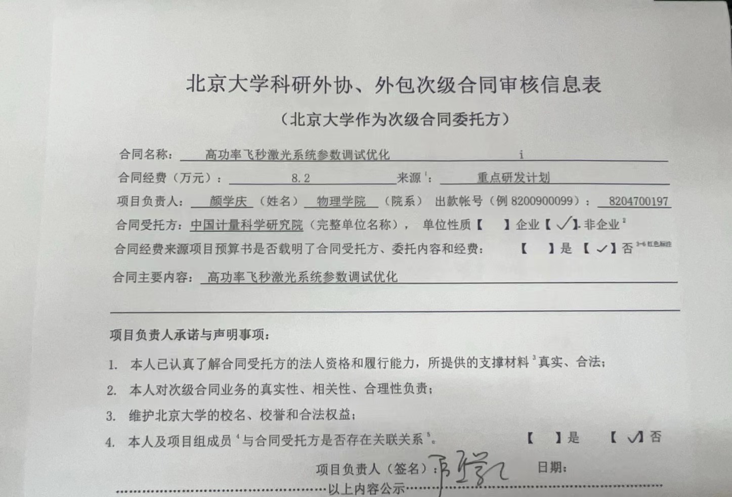 根据《关于北京大学理工科科研次级合同管理的通知》,现将北京大学理工科科研次级合同“高功率飞秒激光系统参数调试优化”相关内容予以公示。