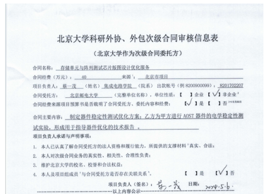 根据《关于北京大学理工科科研次级合同管理的通知》,现将北京大学理工科科研次级合同“存储单元与阵列测试芯片版图设计优化服务”相关内容予以公示。