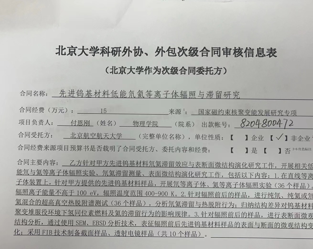 根据《关于北京大学理工科科研次级合同管理的通知》,现将北京大学理工科科研次级合同“先进钨基材料低能氘氦等离子体辐照与滞留研究”相关内容予以公示。