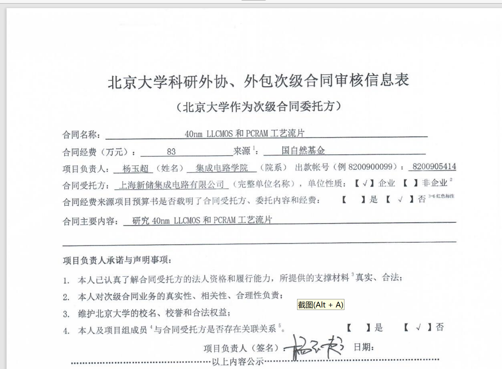 根据《关于北京大学理工科科研次级合同管理的通知》,现将北京大学理工科科 研次级合同“40nm LLCMON 和 PCRAM工艺流片”的相关内容予以公示。公示时间:2024年07月10日-2024年07月12日(3个工作日)。合同相关纸质材料可经预约后到勺园5乙330办公室进行查阅。