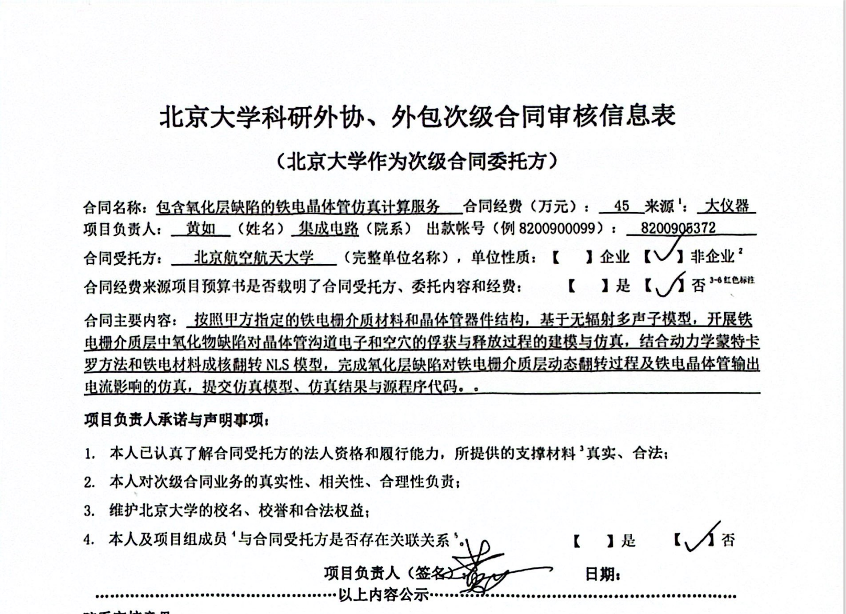 根据《关于北京大学理工科科研次级合同管理的通知》,现将北京大学理工科科 研次级合同“包含氧化层缺陷的铁电晶体管仿真计算服务”的相关内容予以公示。公示时间:2024年07月11日-2024年07月13日(3个工作日)。合同相关纸质材料可经预约后到勺园5乙330办公室进行查阅。