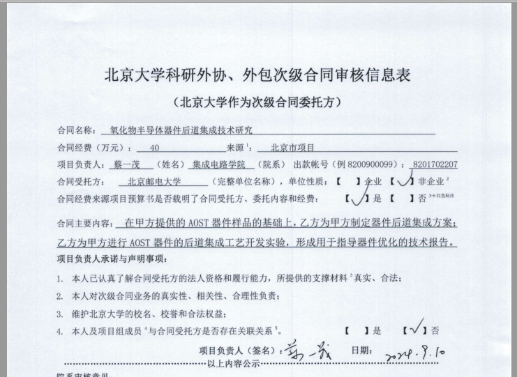 根据《关于北京大学理工科科研次级合同管理的通知》,现将北京大学理工科科研次级合同“氧化物半导体器件后道集成技术研究”相关内容予以公示。