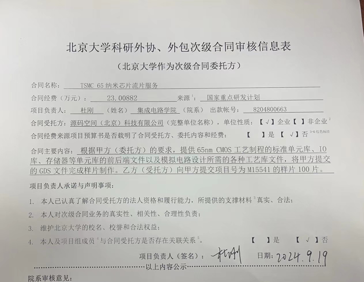 根据《关于北京大学理工科科研次级合同管理的通知》,现将北京大学理工科科研次级合同“TSMC 65纳米芯片流片服务”相关内容予以公示。