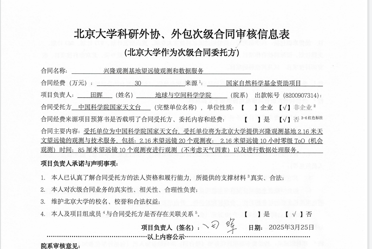 根据《关于北京大学理工科科研次级合同管理的通知》,现将北京大学理工科科研次级合同“兴隆观测基地望远镜观测和数据服务”相关内容予以公示。